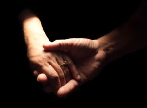 Several adults are gathered around a young girl, placing their hands gently on her shoulders in a supportive gesture. They seem to be outdoors, with trees and a small building visible in the background. The scene conveys a sense of care and community.